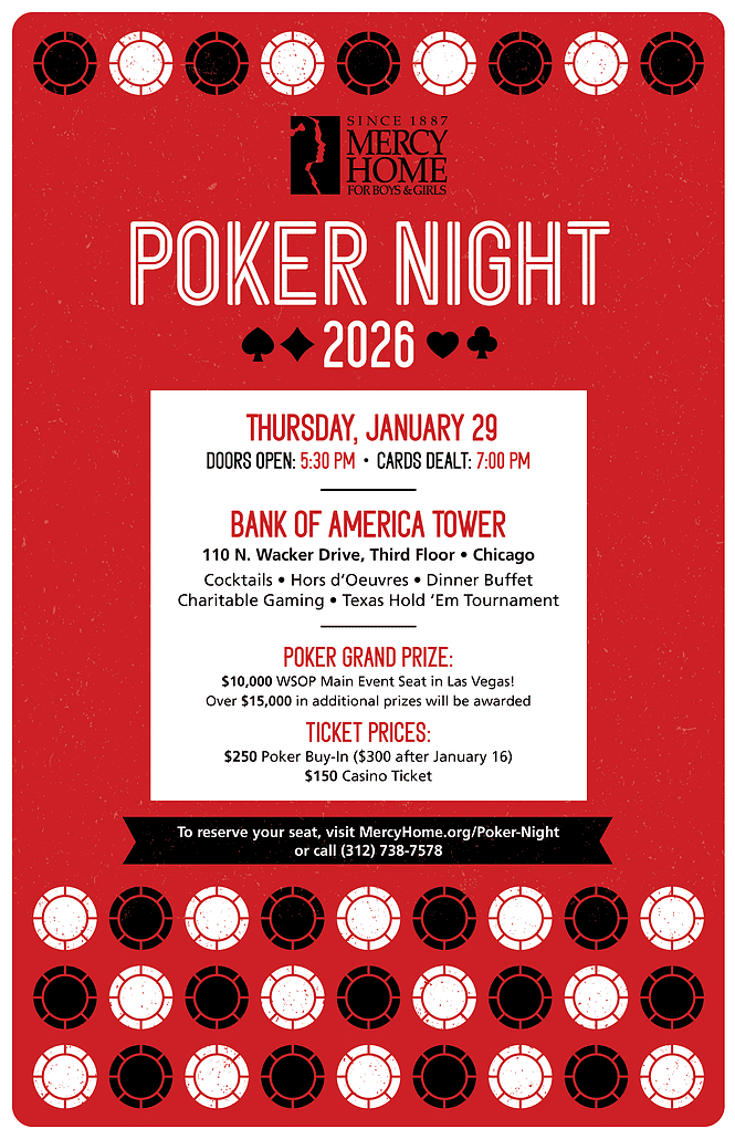 Join us for Mercy Home for Boys & Girls’ 13th annual Poker Night on Thursday, January 29, 2026. All proceeds from the evening will support the young people living at Mercy Home. The grand prize for our Texas Hold ’em tournament is a seat at the 2026 World Series of Poker Main Event in Las Vegas. $15,000 in additional prizes are also available! Guests will also enjoy cocktails, hors d’euvres, a dinner buffet, and more!