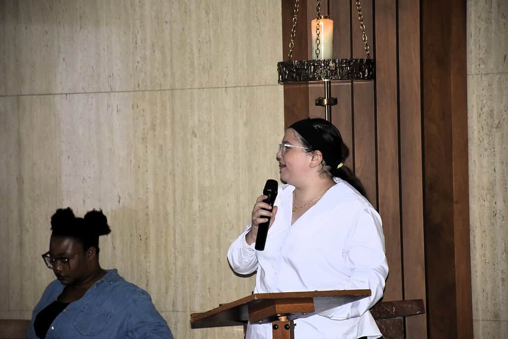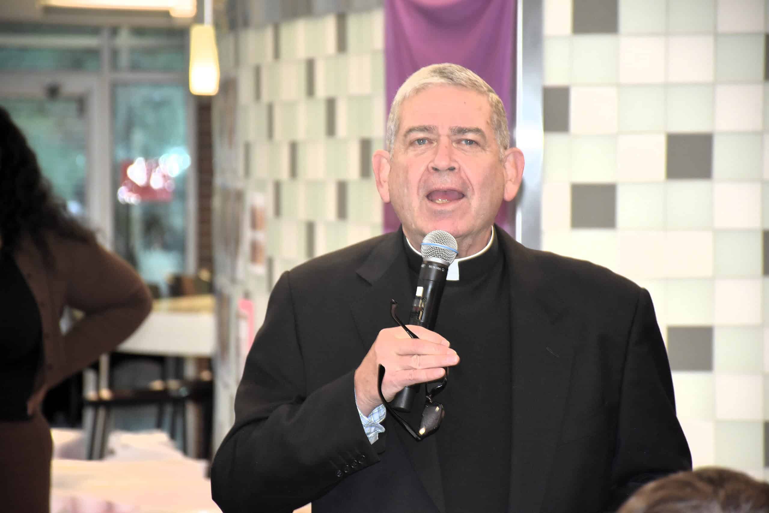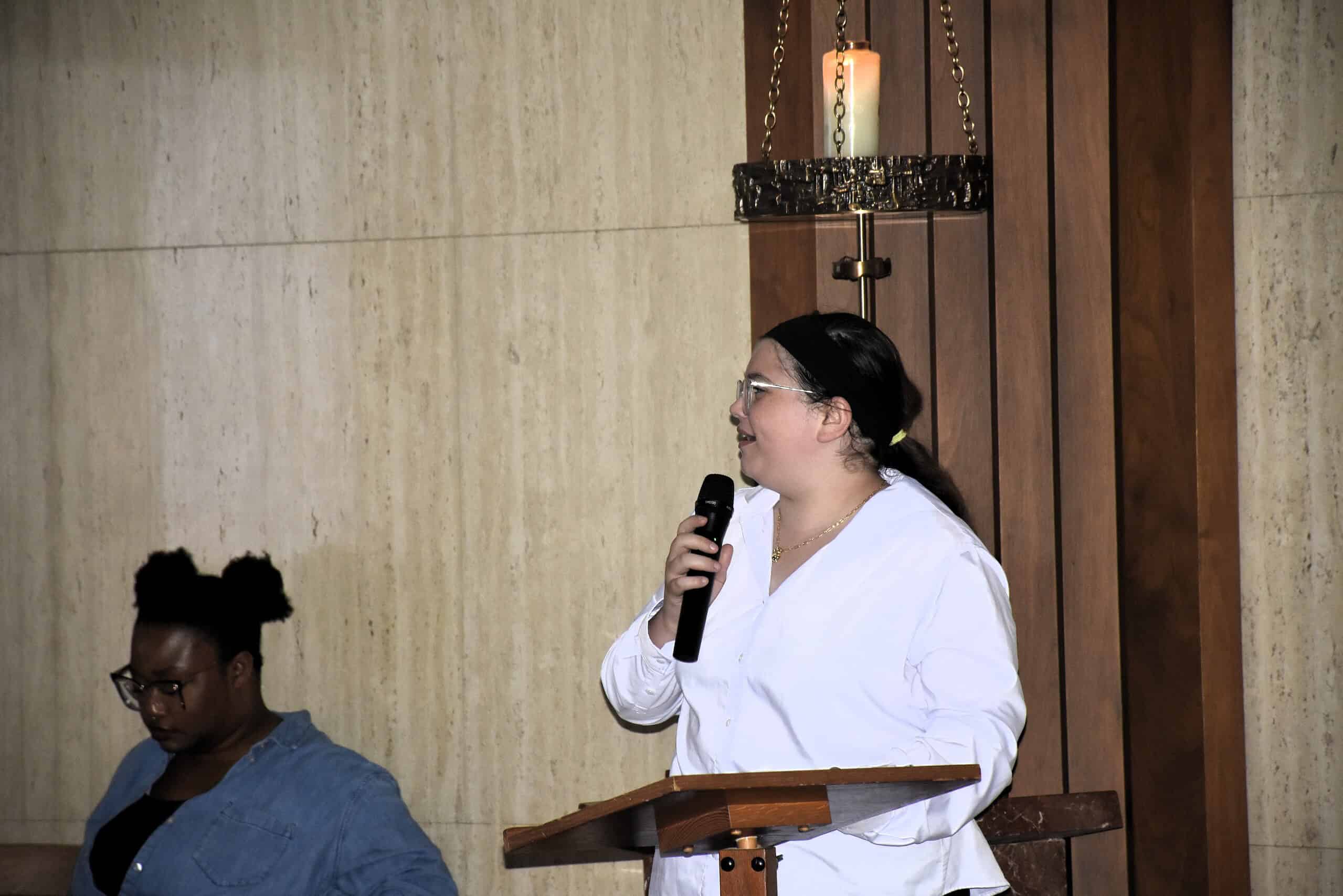 Following the youth speeches, Fr. Scott gave his Easter reflection, starting with a reading of the Gospel of Matthew describing Jesus’s execution and Judas’s remorse for his betrayal. Fr. Scott then showed the young people and coworkers a photo of a carving inside a medieval basilica in France. It shows Jesus carrying Judas’s body on His shoulders, symbolizing God’s boundless love and mercy.