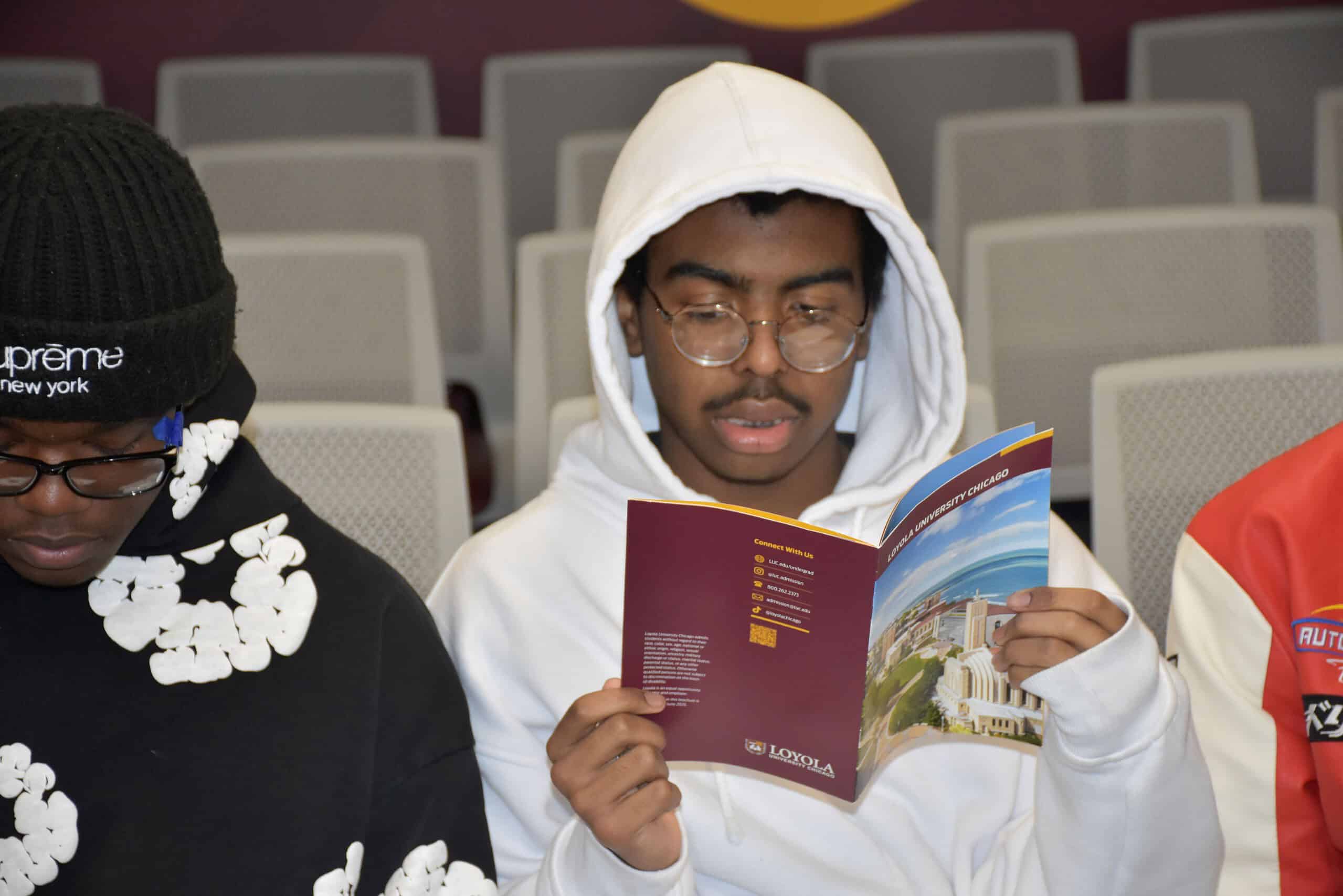 A visit to Loyola University Chicago began with an informational session before the group headed outside for a full campus tour. They explored key parts of campus life, including a student dining hall, the Madonna della Strada Chapel, and lakefront views along Lake Michigan. Along the way, they learned about admissions requirements and the range of support services available to Loyola students.