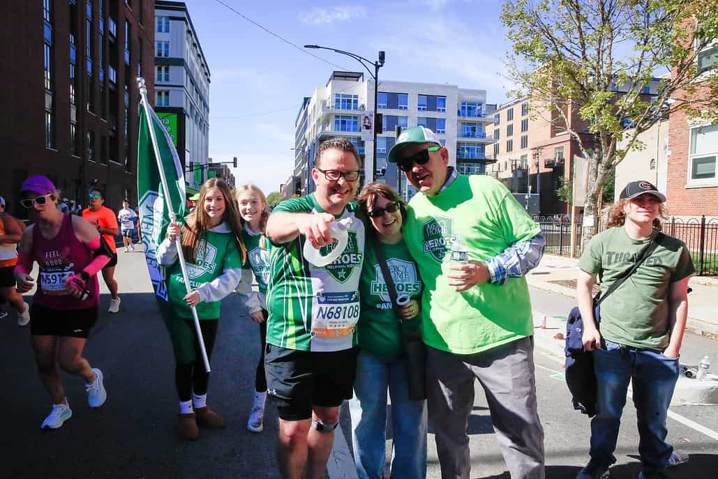 Coworkers, youth, runners’ family members and friends, West Loop neighbors, and others lined up along the Mercy Mile, waving signs and making noise. Runners stopped to hug supporters before continuing their quest for the finish line. To herald the arrival of each Hero to the Mercy Mile, volunteers ran alongside them waving green flags with the Mercy Home Heroes crest as they made their way down the block.