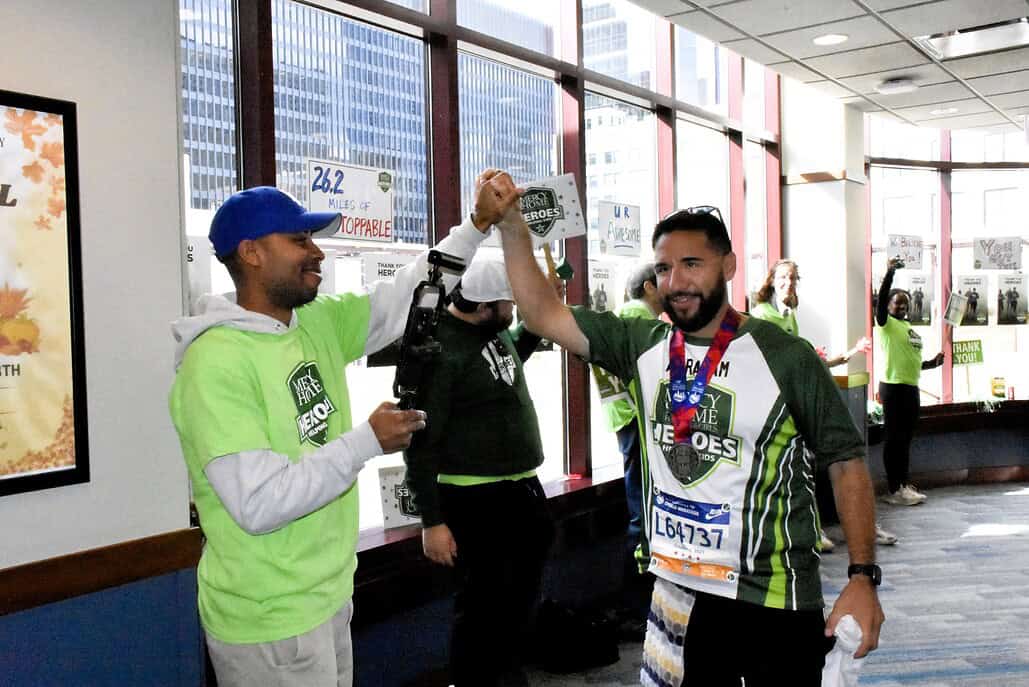 For our runners, we don’t stick to just one Hero’s welcome, however. When our Heroes arrived at the official “Heroes Headquarters,” located in DePaul University’s student center in the Loop, they were greeted and congratulated by coworkers, volunteers, and loved ones before enjoying refreshments and complimentary massages from our friends at Revolution Physical Therapy.