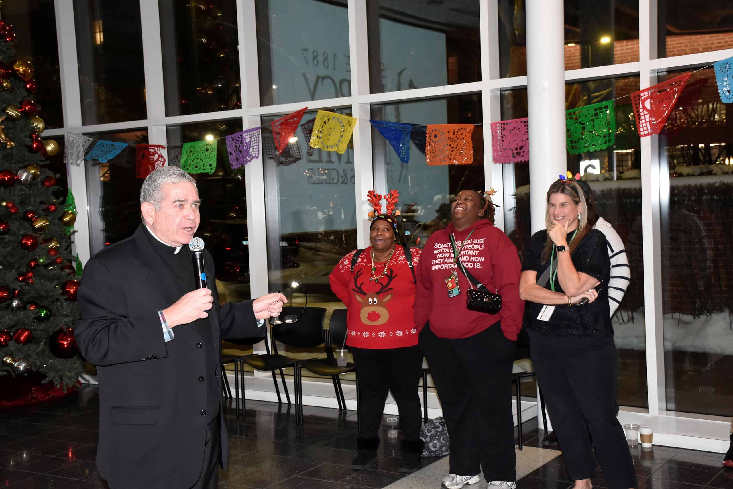 The festivities began with Christmas carols, led by coworkers, and some delicious hot cocoa for guests. Mercy Home President and CEO Fr. Scott Donahue then offered his Christmas reflection following a reading of Luke’s Gospel.
