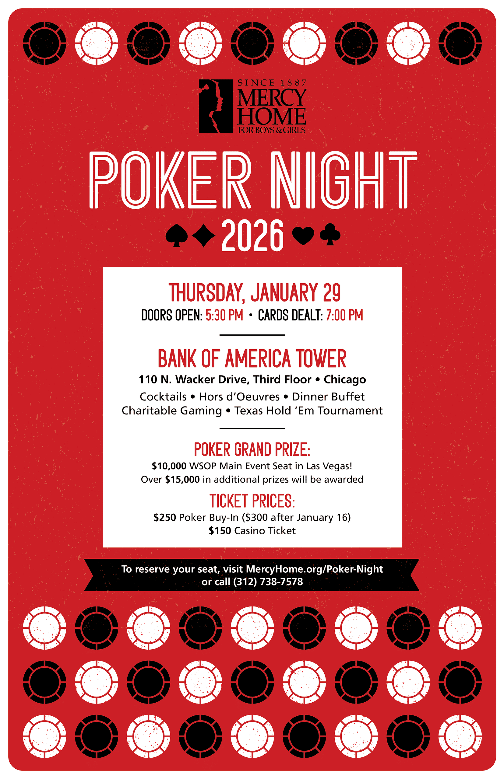 Join us for Mercy Home for Boys & Girls’ 13th annual Poker Night on Thursday, January 29, 2026. All proceeds from the evening will support the young people living at Mercy Home. The grand prize for our Texas Hold ’em tournament is a seat at the 2026 World Series of Poker Main Event in Las Vegas. $15,000 in additional prizes are also available! Guests will also enjoy cocktails, hors d’euvres, a dinner buffet, and more!